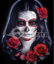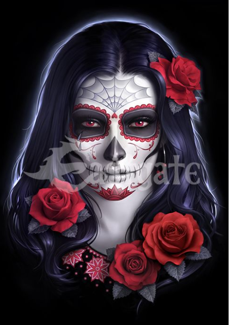 The design features a captivating woman’s face adorned in the traditional sugar skull (calavera) makeup, detailed with intricate white patterns and bold red accents that evoke both grace and power. Framed by flowing black hair and deep crimson roses, her stare is both haunting and serene—bridging the realms of the living and the dead. A shadowy skeletal motif beneath adds a further depth of mystery and meaning.