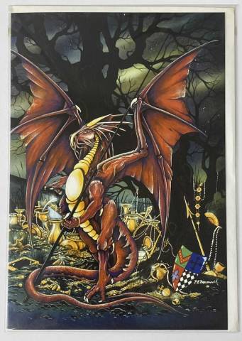 Surrounded by goblets, jewels, and relics of fallen knights, the scene is rich with detail and magic—perfect for collectors, fantasy fans, or anyone who loves dragons and legendary lore.