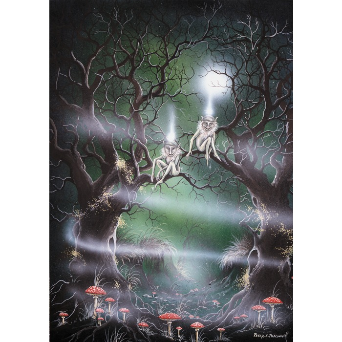 Step into the heart of an enchanted forest with “Tree Spirits”, a luminous fantasy art piece by visionary artist Peter Pracownik. This ethereal scene glows with otherworldly light, where delicate, glowing fae and tree spirits dance above a forest glade. Their translucent forms spiral gently through the mist, bridging the realms of nature and spirit in a breathtaking ballet of light and energy.