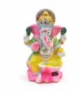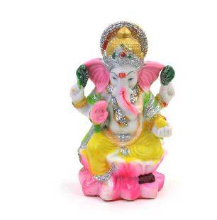 Vibrant Ganesh statue from India decorated in very bright colours, with glitter and silver and gold paint. This quintessentially Indian style statue of Lord Ganesha shows the elephant god sitting on a lotus.