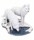 this stunning figurine features two beautiful wolves stopping to drink from the icy waters. One wolf cautiously looks out for the other as it drinks. Cast in resin and beautifully hand painted.