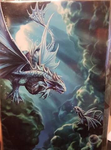 Step into a world of fantasy with "Draco Aqua – Water Dragon", a breathtaking art card by renowned fantasy artist Anne Stokes. This striking illustration features a majestic aquatic dragon with shimmering silver-blue scales, emerging powerfully through a lush canyon waterfall. With wings unfurled and claws extended, the dragon’s motion is both graceful and commanding—embodying the spirit of water in its purest, most magical form.