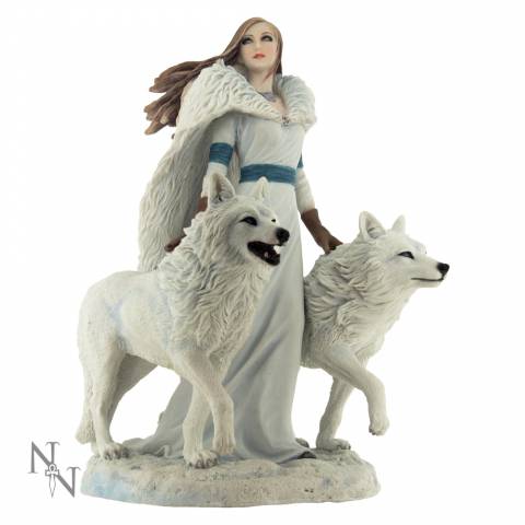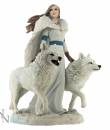 Standing tall on the snowy ground (23cm to be precise), this young woman has a white wolf at each side, walking forwards and alert to danger. Her long white dress hangs to the floor as she lays a gloved hand on the back of each wolf, gently reassuring and restraining them. Her long white fur cloak hangs down behind her back as she scans the horizon, chestnut hair blowing behind her in the wind. Cast in the best quality resin before being lovingly hand-painted, this figurine is a great gift for anyone who feel the call of the wild.