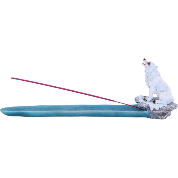 Perched on a rock at the end of the incense burner is a snowy white wolf. With snow beneath their paws they howl into the sky, calling out to their fellow wolf pack. The incense burner is coloured blue acting as the icy cold water. A small hole is situated below the wolf, perfect for adding your favourite incense sticks. Cast in the finest resin before being expertly hand-painted, this incense burner is perfect for any animal or wolf lover.
