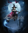 Clad in classic black with a deep magenta cloak trailing behind her, the witch exudes confidence and mystique. Bats circle overhead as she streaks across a moonlit sky, with a magical blue energy swirling in her wake. Below, a gothic castle looms through the mist, completing the scene with a sense of mystery and dark allure.
