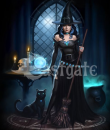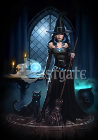 At the heart of the piece stands a commanding witch clad in flowing black, her gaze calm yet potent beneath a classic pointed hat. She is surrounded by arcane tools of the craft — a glowing crystal ball, ancient grimoire, flickering candles, and a bubbling cauldron casting eerie light across the stone chamber. A sleek black cat — her ever-faithful familiar — rests at her feet, adding to the scene's magical intensity.