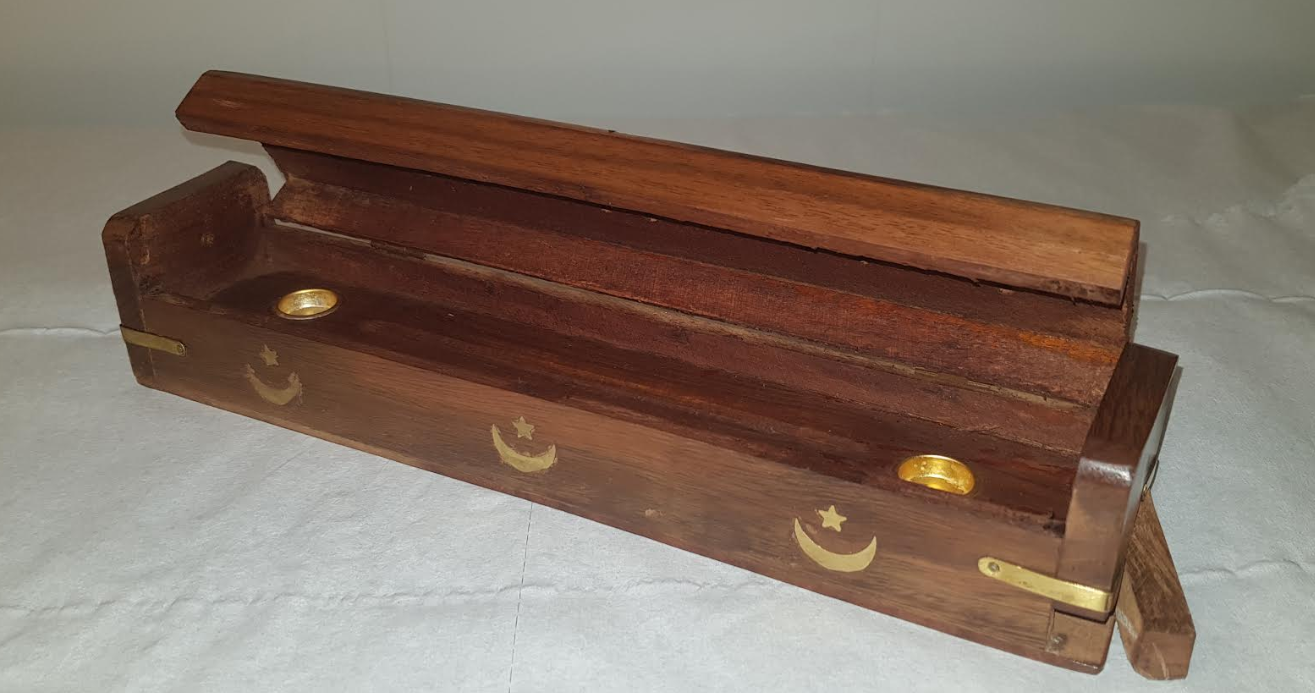 Square incense box that holds both incense sticks and cones. Simply light incense, put in box and shut lid. Small storage at base .