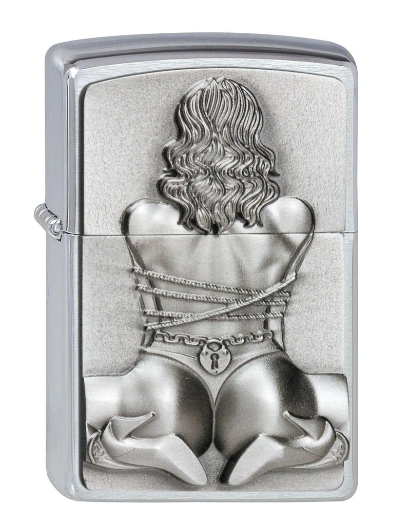 A stylish Chrome Brushed Zippo lighter featuring a woman in chains. A detailed emblem design guaranteed to catch your eye! Comes packaged in a gift box. For optimal performance, fill with Zippo lighter fuel.