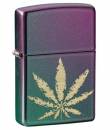 This model features a simple leaf auto engraved on the surface of a new Iridescent lighter. The exposed brass in the leaf contrasts perfectly off the turquoise and violet ombre satin-like finish of the Iridescent base model. Comes packaged in a gift box. For optimal performance, fill with Zippo lighter fuel.